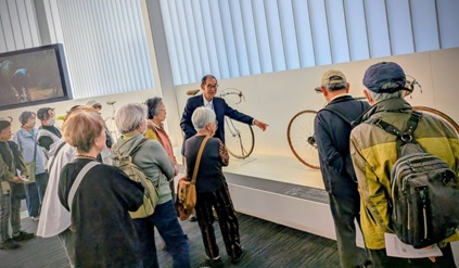 | シマノ自転車博物館・見学 秋晴れの10月23日(木)午前10時、南海高野線「堺東駅」に集合した16名の参加者は、5分歩いて「シマノ自転車博物館」に到着しました。 館内では、まず自転車の起源から黎明期〜発展期までの進化を大きなパノラマ映像で鑑賞しまた。次いで、係の方の案内で、1階、2階、4階と、世界の自転車の歴史や、発明家たちの夢、科学や未来などについて、世界の自転車の実物の展示に従ってわかりやすく説明して頂きました。 約1時間半の見学を終えた後に、10分ほど歩いてレストランに到着。皆で楽しく歓談しながらランチを共にしました。有意義な一日を過しました。 |